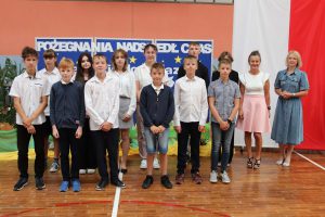 P. E. Wyszyńska nagrodziła dyplomami uczniów, którzy godnie reprezentowali szkołę w poczcie sztandarowym.