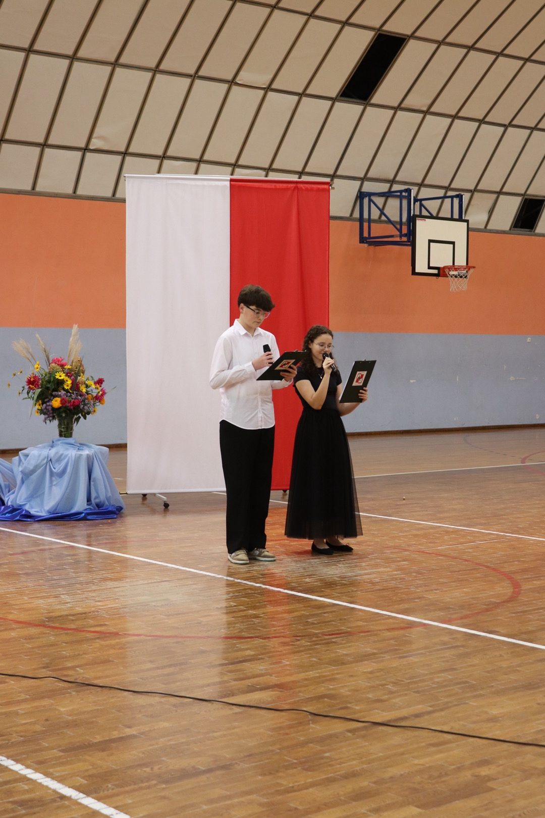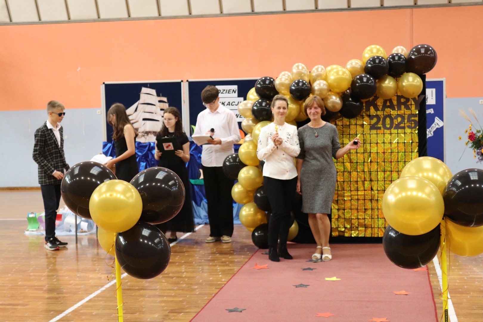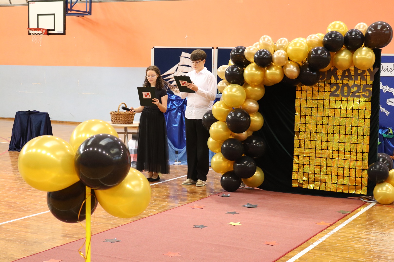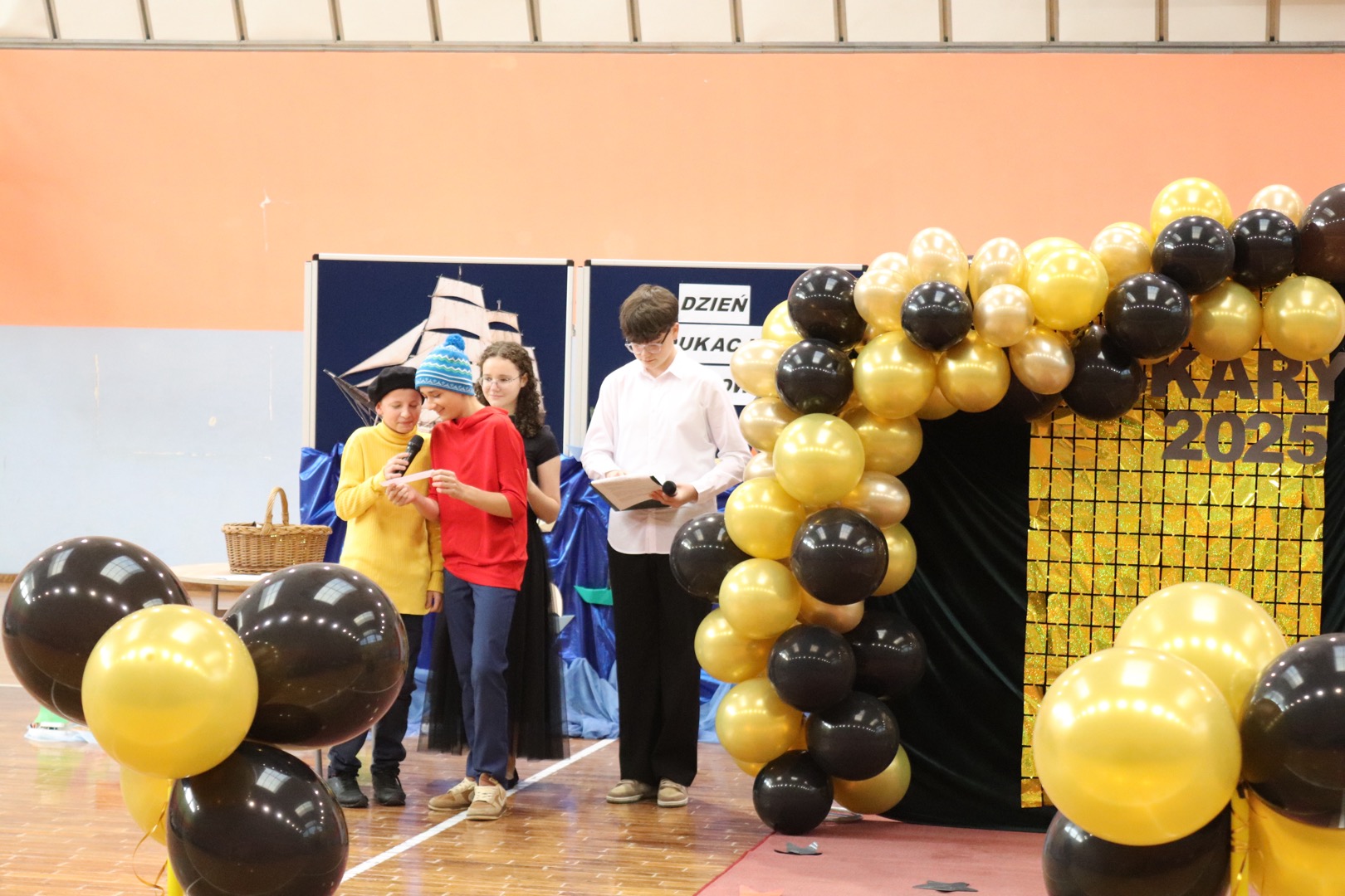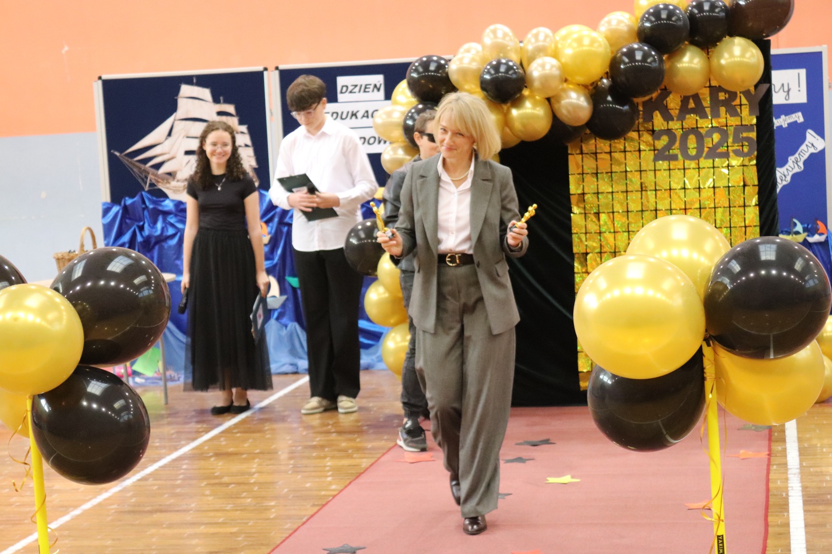 na scenę wkroczyli prowadzący – Gabrysia i Antek, którzy z humorem i elegancją powitali wszystkich zgromadzonych i złożyli nauczycielom życzenia – satysfakcji, radości, dumy z wykonywanej pracy, niekończącej się cierpliwości oraz zawsze gorącej kawy. Podkreślili, że szkoła to coś więcej niż budynek – to wspólnota tworzona przez ludzi pełnych pasji i serca.