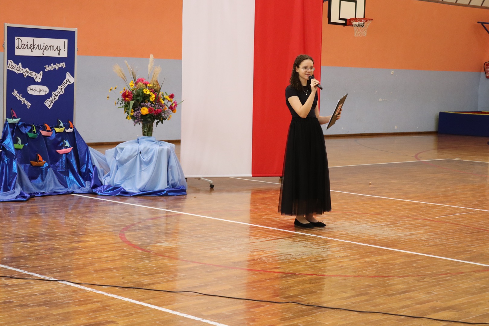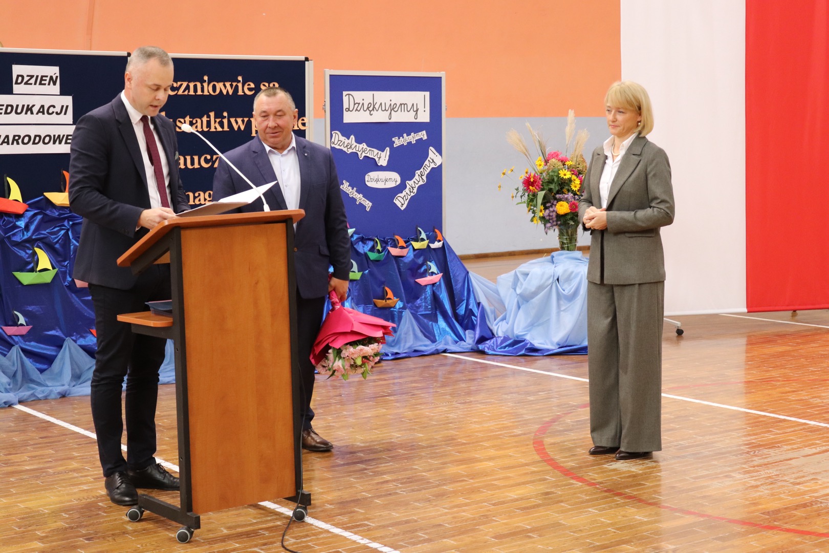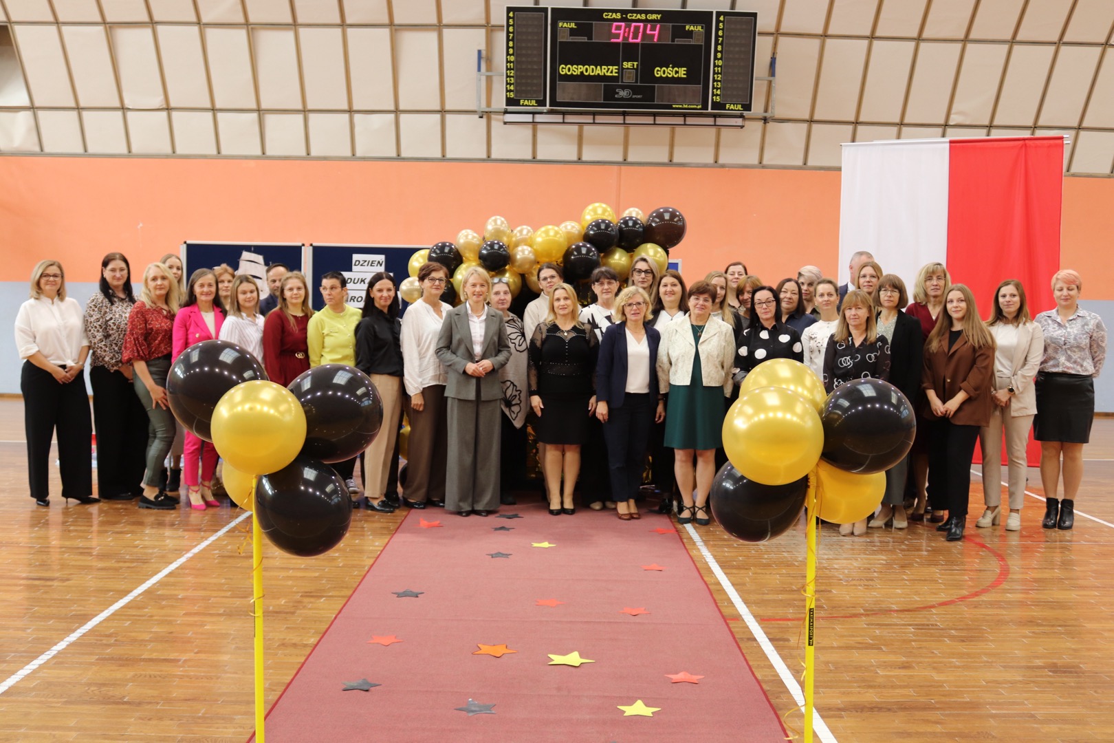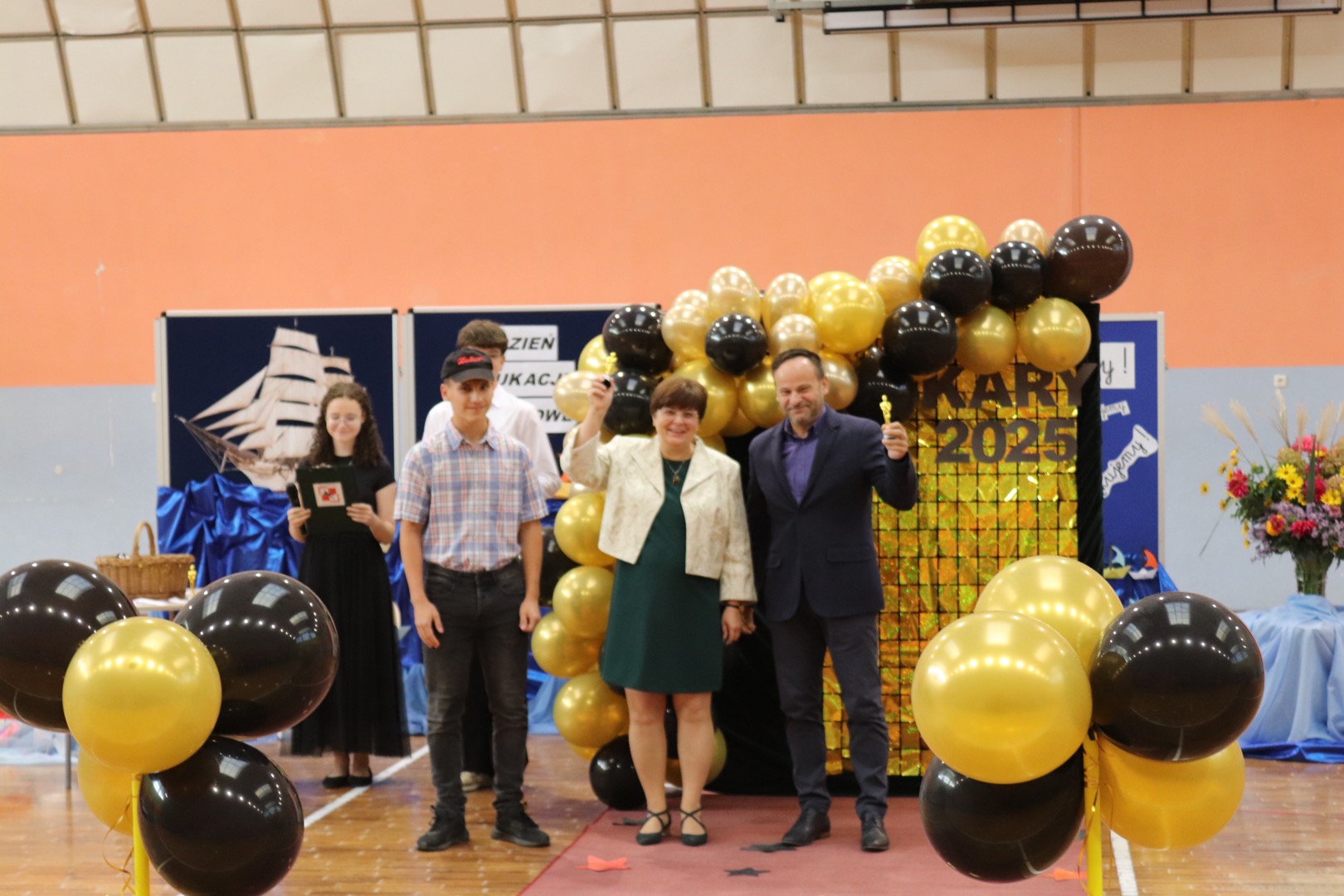 na scenę wkroczyli prowadzący – Gabrysia i Antek, którzy z humorem i elegancją powitali wszystkich zgromadzonych i złożyli nauczycielom życzenia – satysfakcji, radości, dumy z wykonywanej pracy, niekończącej się cierpliwości oraz zawsze gorącej kawy. Podkreślili, że szkoła to coś więcej niż budynek – to wspólnota tworzona przez ludzi pełnych pasji i serca.