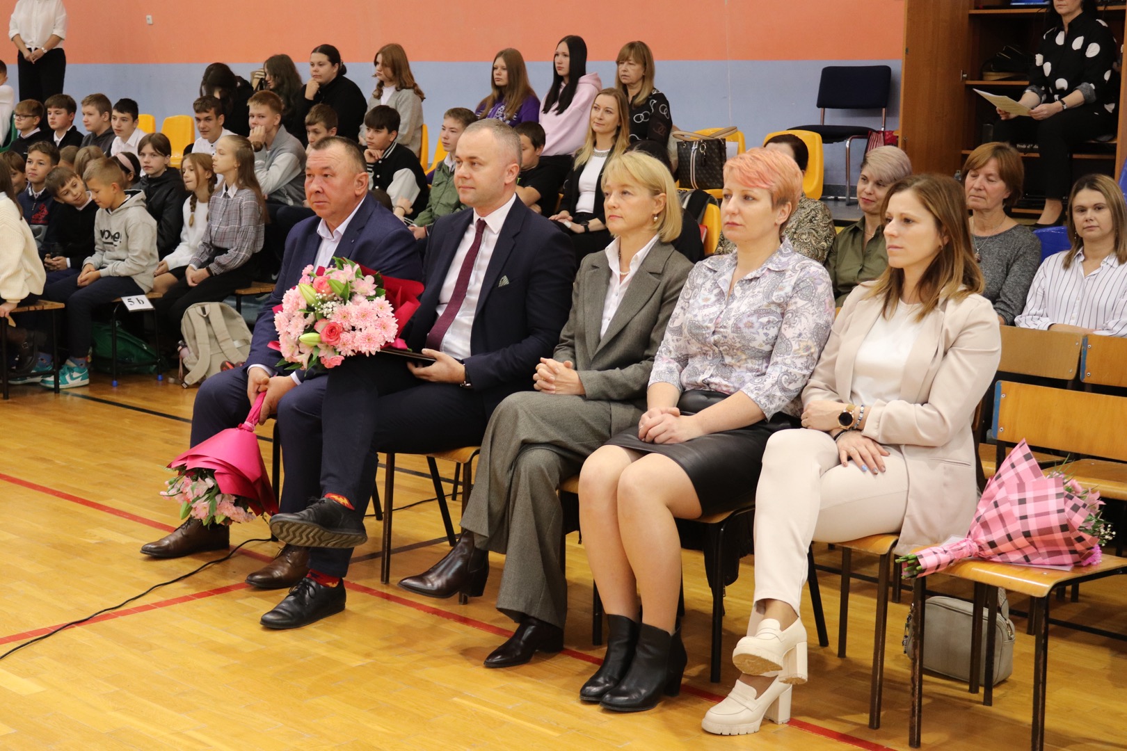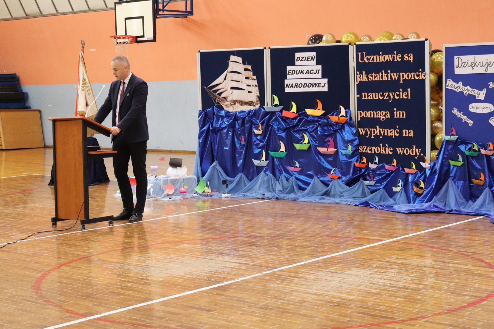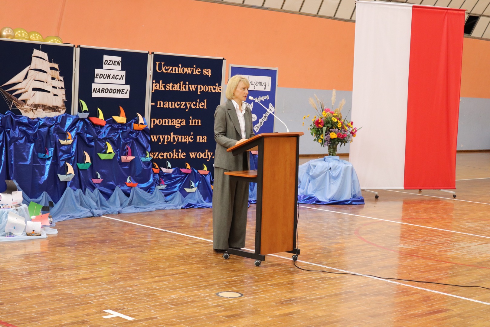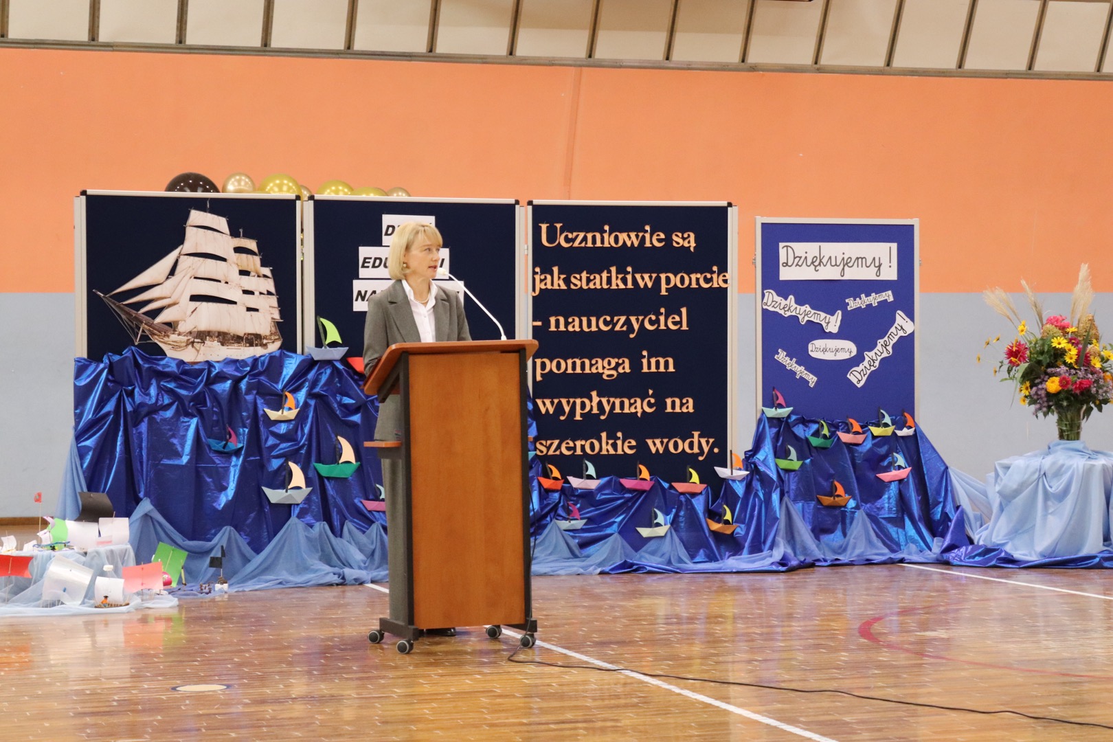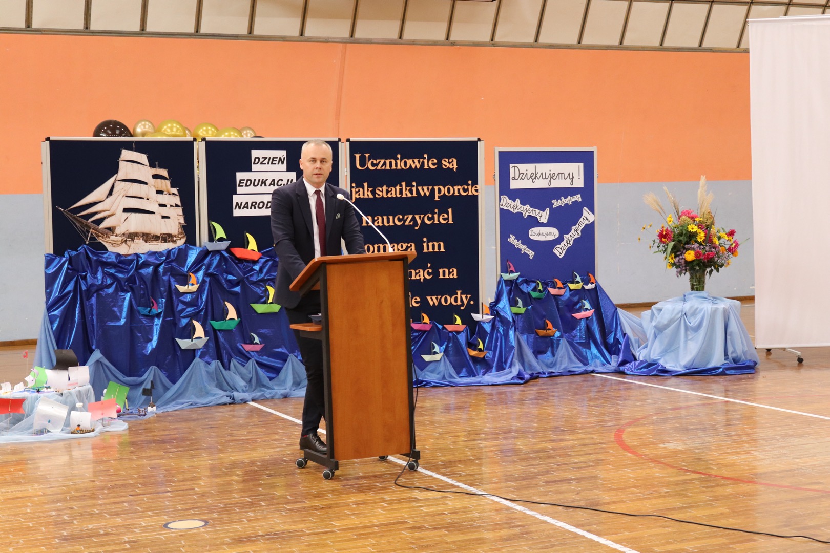na scenę wkroczyli prowadzący – Gabrysia i Antek, którzy z humorem i elegancją powitali wszystkich zgromadzonych i złożyli nauczycielom życzenia – satysfakcji, radości, dumy z wykonywanej pracy, niekończącej się cierpliwości oraz zawsze gorącej kawy. Podkreślili, że szkoła to coś więcej niż budynek – to wspólnota tworzona przez ludzi pełnych pasji i serca.