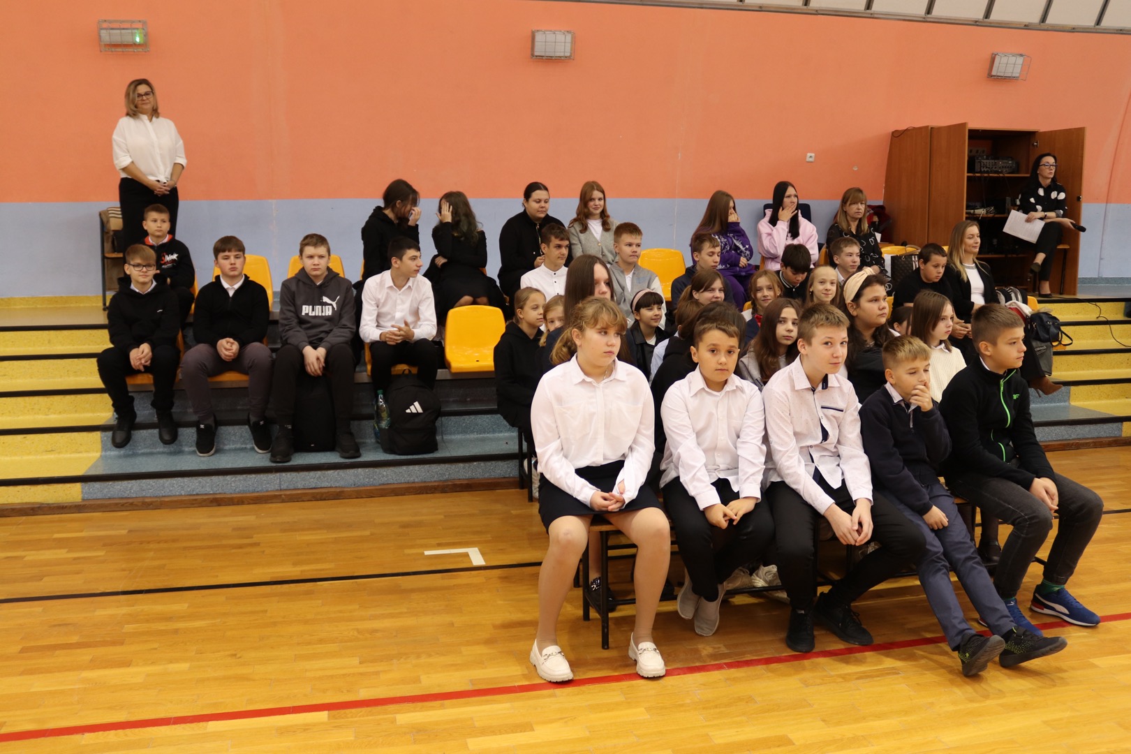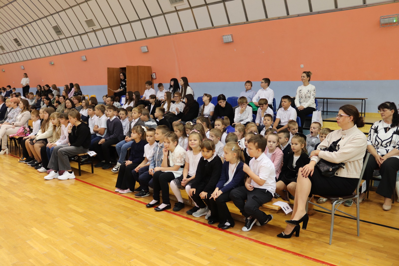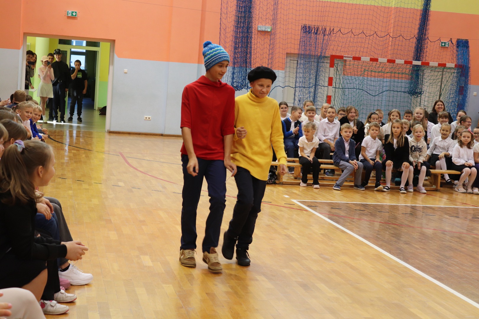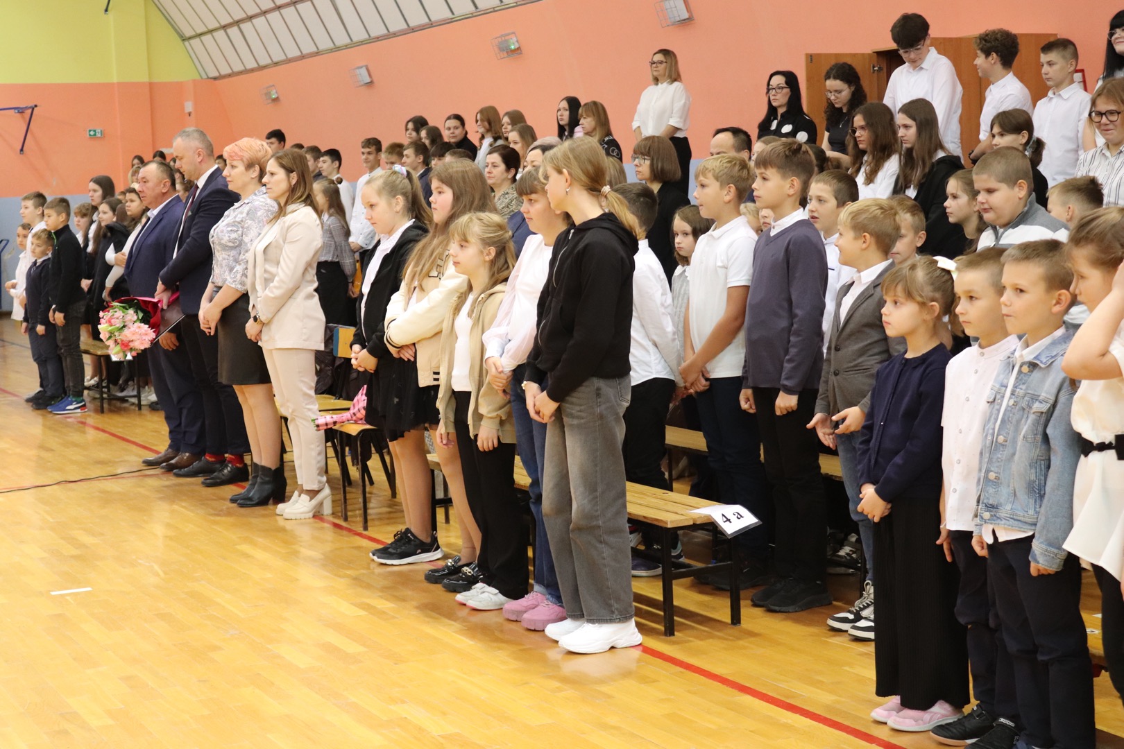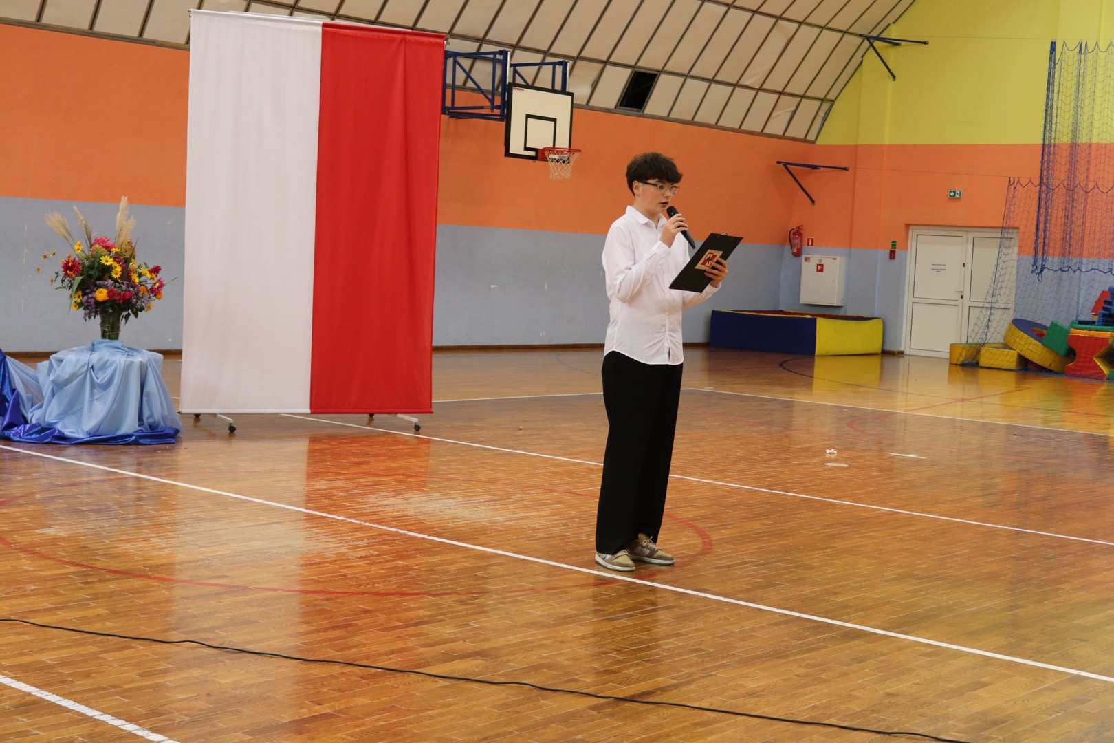 na scenę wkroczyli prowadzący – Gabrysia i Antek, którzy z humorem i elegancją powitali wszystkich zgromadzonych i złożyli nauczycielom życzenia – satysfakcji, radości, dumy z wykonywanej pracy, niekończącej się cierpliwości oraz zawsze gorącej kawy. Podkreślili, że szkoła to coś więcej niż budynek – to wspólnota tworzona przez ludzi pełnych pasji i serca.