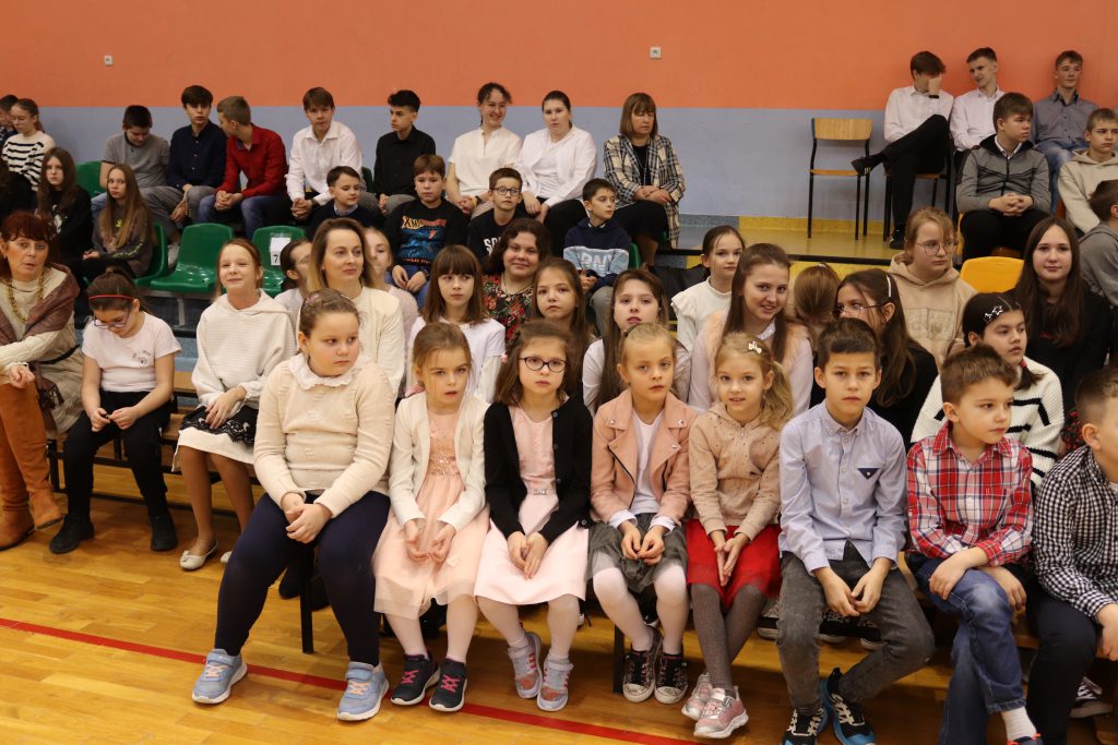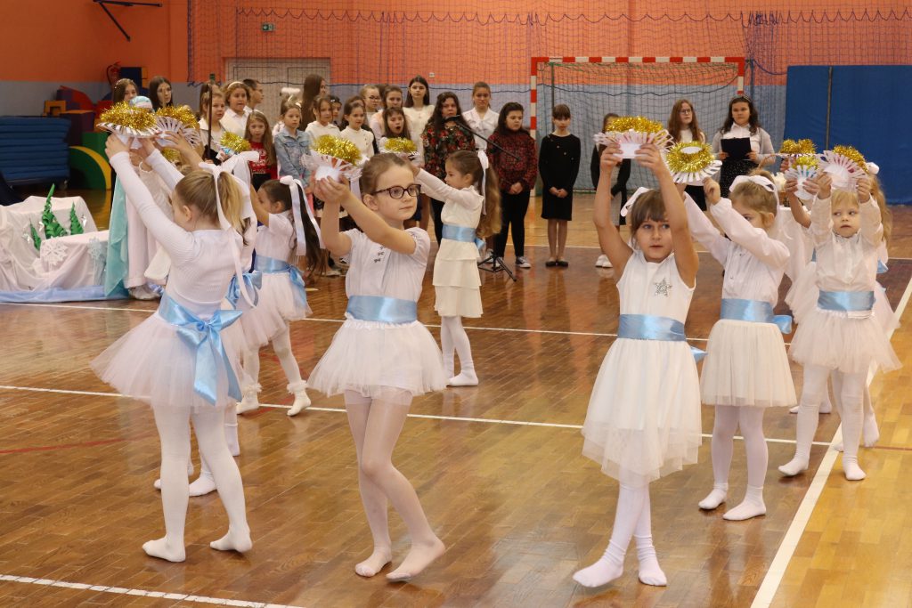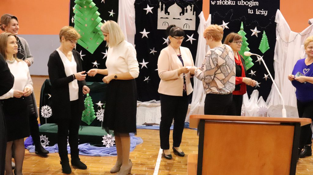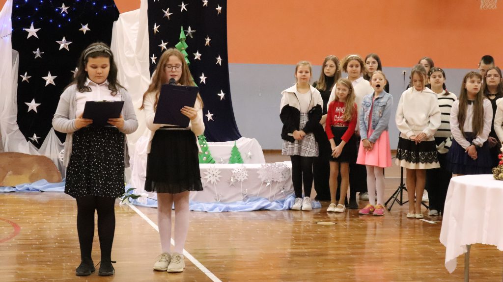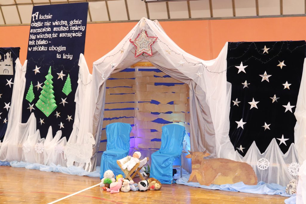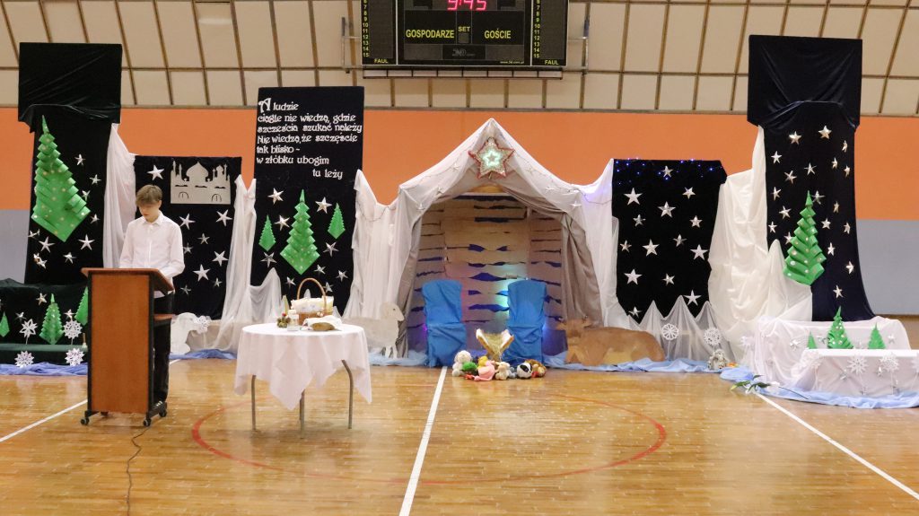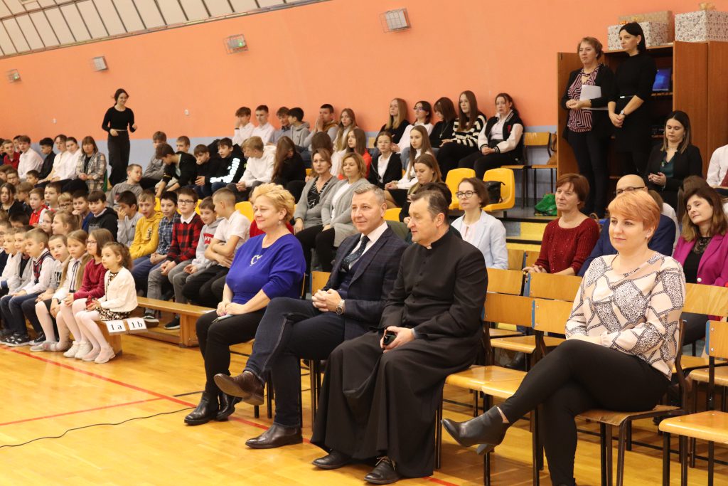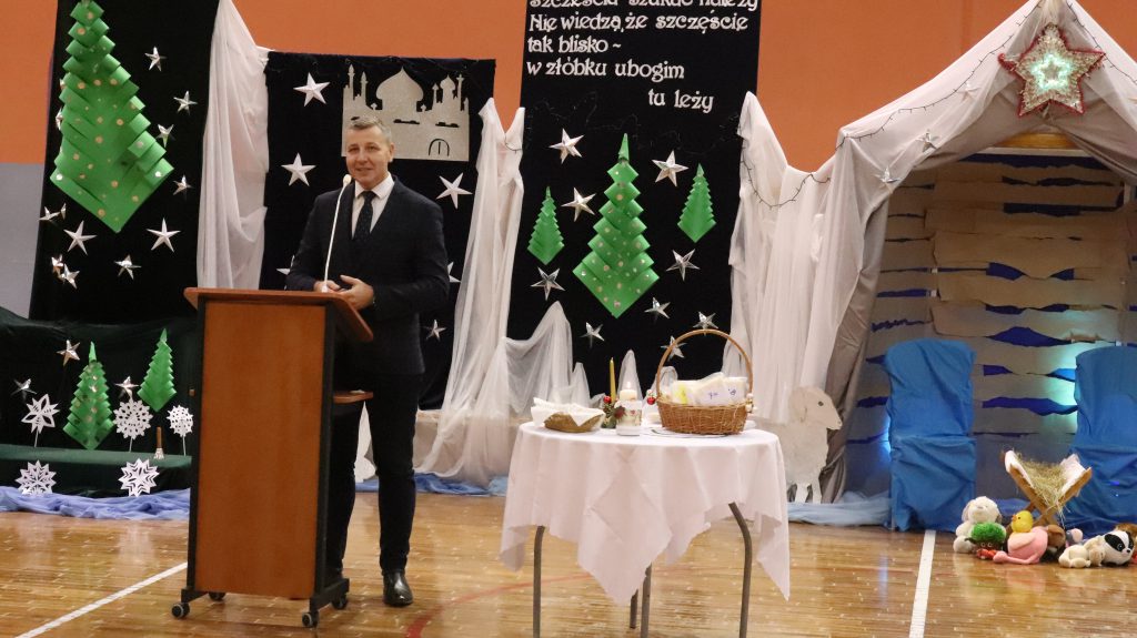 22 grudnia 2023 r. w naszej szkole odbyło się spotkanie wigilijne. Wszyscy zebraliśmy się w hali sportowej. Uroczystość zaszczycili zaproszeni goście: Wójt Gminy Pan Ireneusz Demianiuk, Ksiądz Kanonik Mieczysław Pociejuk- proboszcz naszej parafii, Przewodnicząca Rady Rodziców Pani Katarzyna Prokopiuk oraz nauczyciele odchodzący na emeryturę Pani Bogusława Steckiewicz i Pan Cezary Steckiewicz.