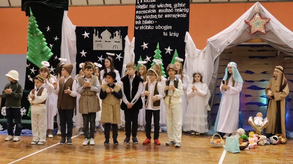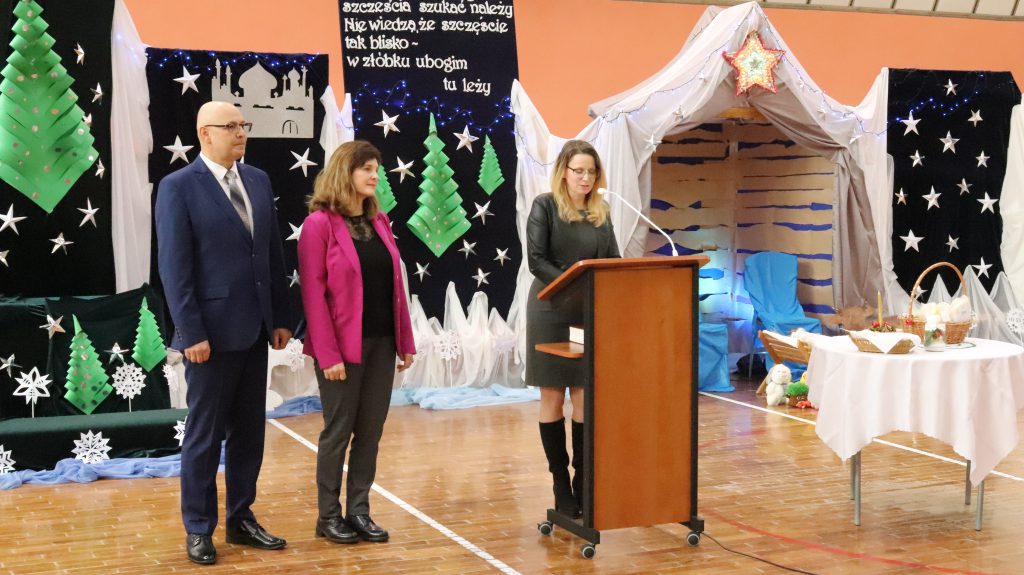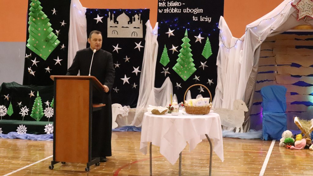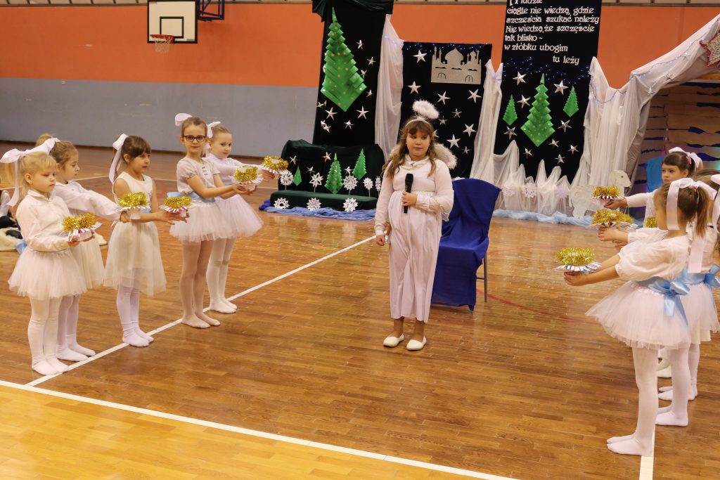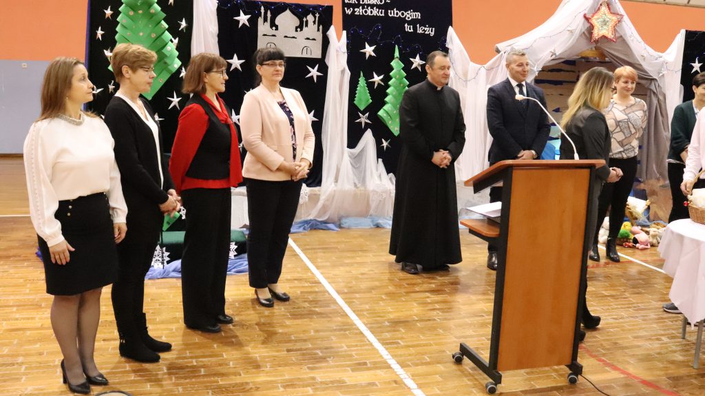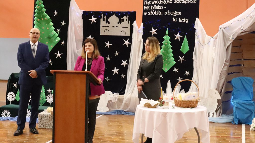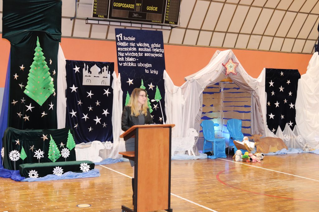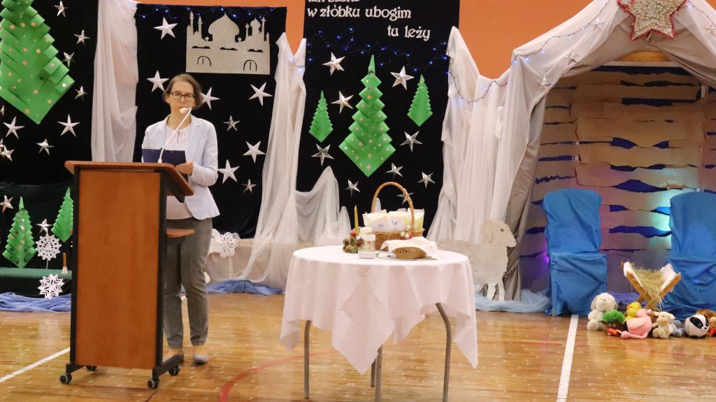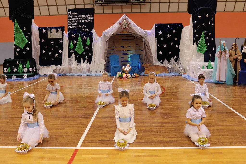Uroczystość rozpoczęła Pani Wicedyrektor Agnieszka Hermaniuk, która złożyła wszystkim serdeczne życzenia z okazji nadchodzących Świąt Bożego Narodzenia. Następnie mogliśmy obejrzeć występy dzieci. Były to jasełka w wykonaniu uczniów klas trzecich i członków Szkolnego Koła Caritas oraz taniec aniołów i pasterzy zaprezentowany przez dzieci z oddziału przedszkolnego.