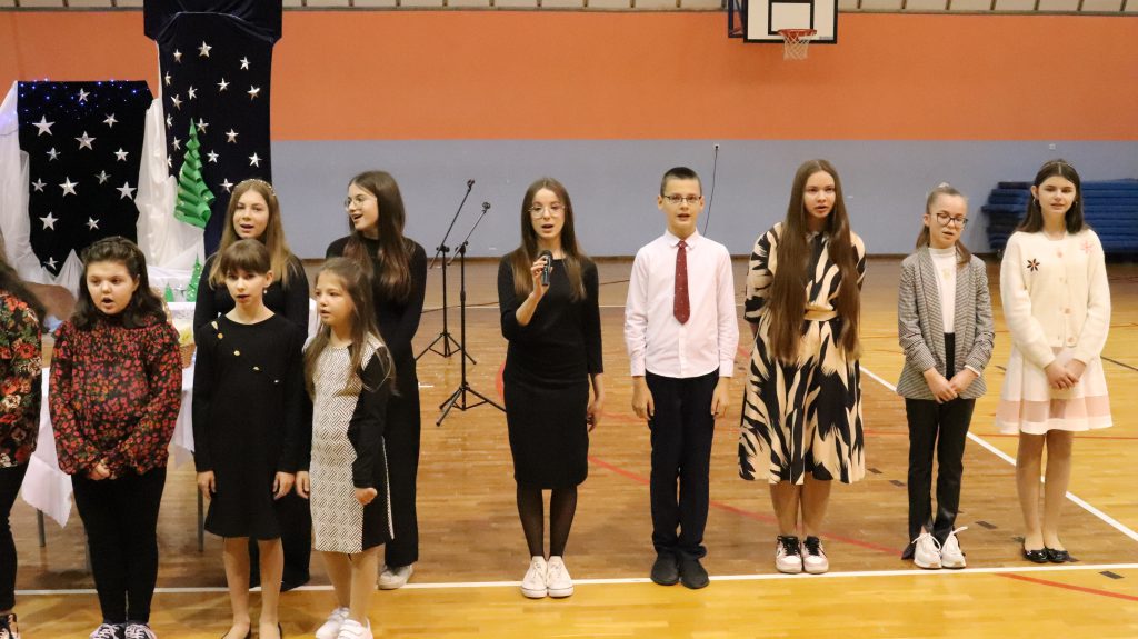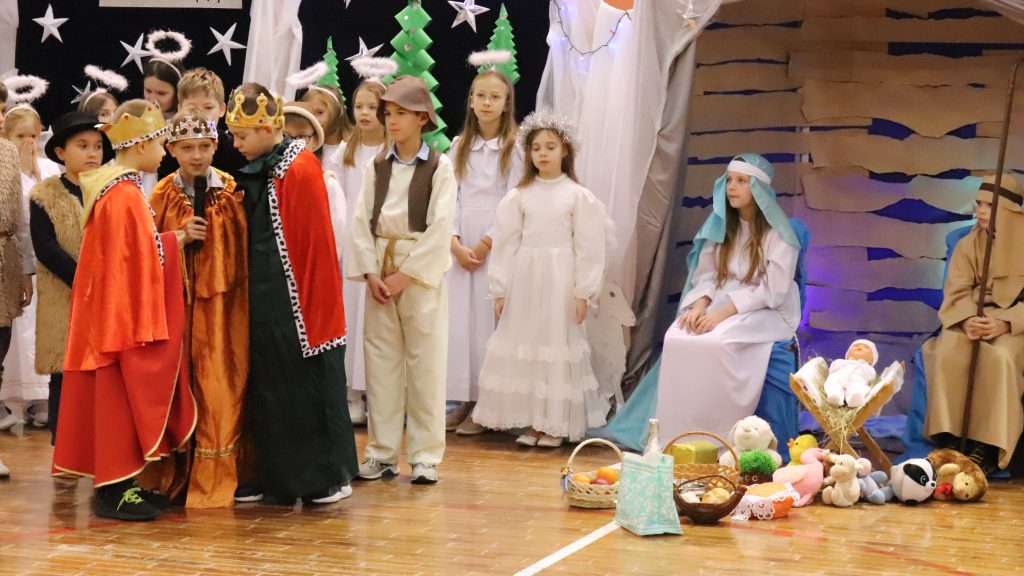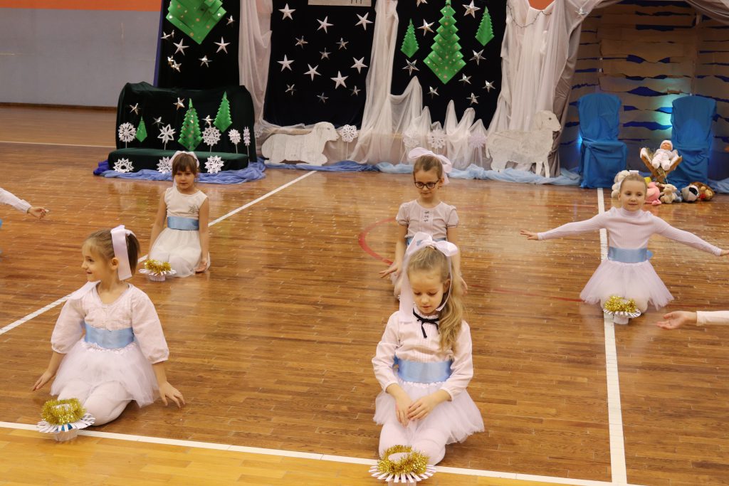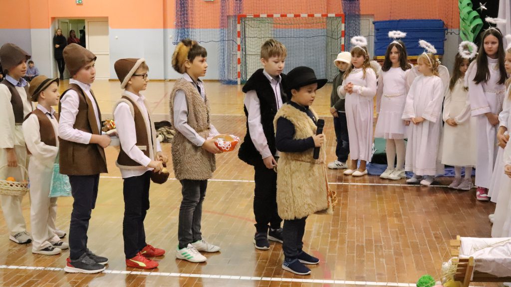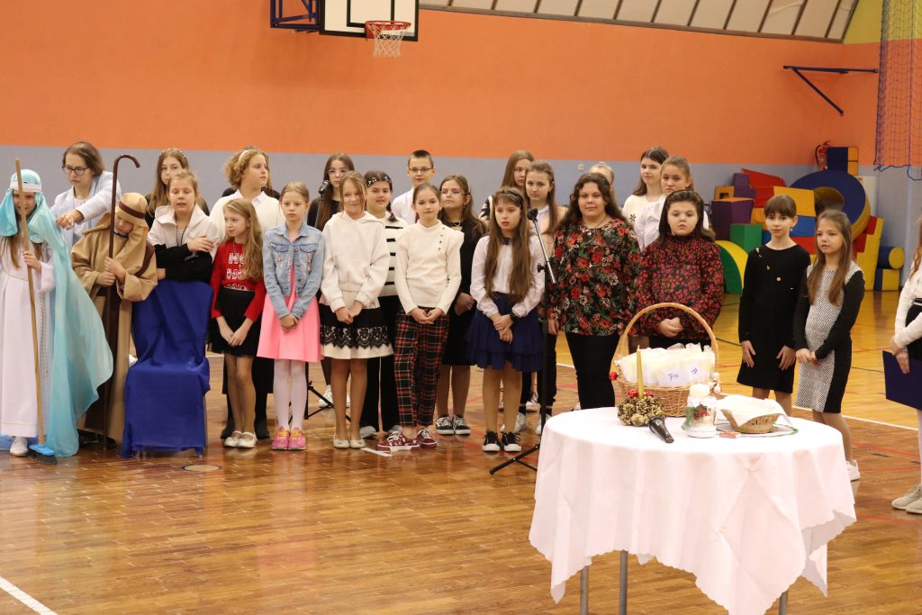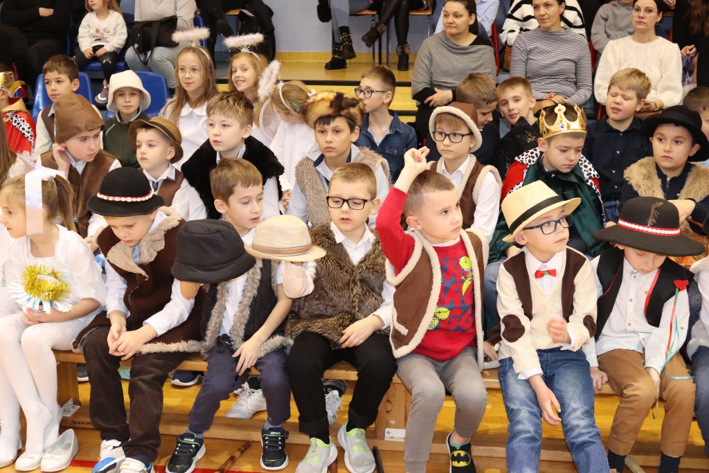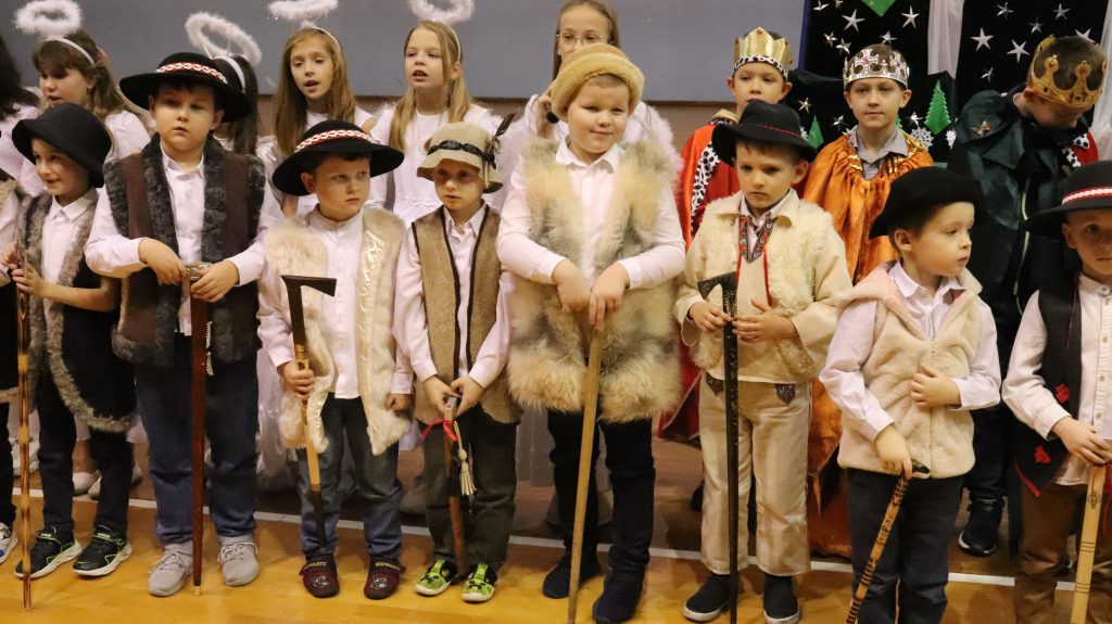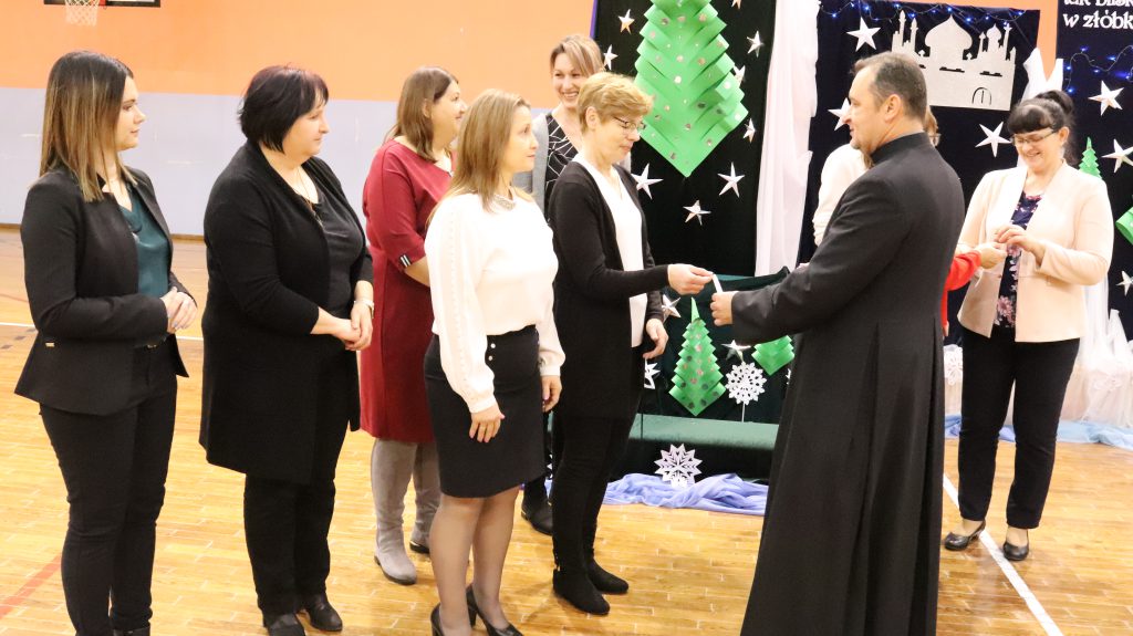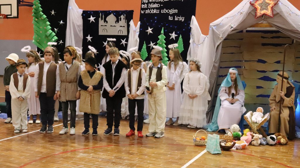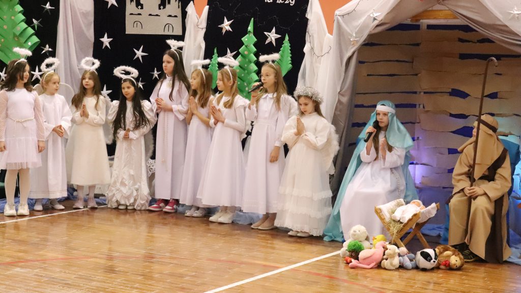 Uroczystość rozpoczęła Pani Wicedyrektor Agnieszka Hermaniuk, która złożyła wszystkim serdeczne życzenia z okazji nadchodzących Świąt Bożego Narodzenia. Następnie mogliśmy obejrzeć występy dzieci. Były to jasełka w wykonaniu uczniów klas trzecich i członków Szkolnego Koła Caritas oraz taniec aniołów i pasterzy zaprezentowany przez dzieci z oddziału przedszkolnego.