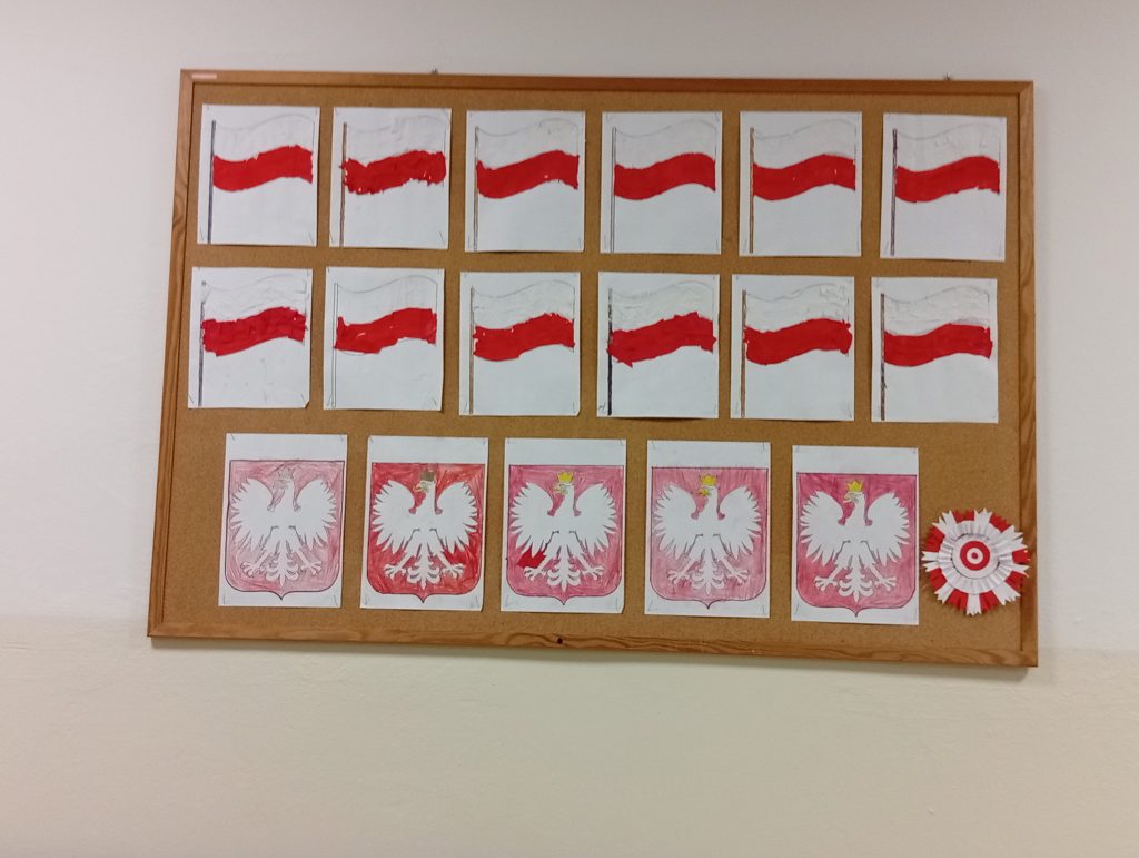 W świetlicy szkolnej przygotowano okolicznościową gazetkę z okazji Narodowego Święta Niepodległości, która wprowadziła uczniów w atmosferę listopadowego świętowania. Centralnym elementem dekoracji były polskie flagi oraz godła, wykonane przez dzieci w różnych technikach plastycznych. Na gazetce znalazły się biało-czerwone symbole narodowe, a także prace przedstawiające Orła Białego, starannie odwzorowanego przez uczniów.