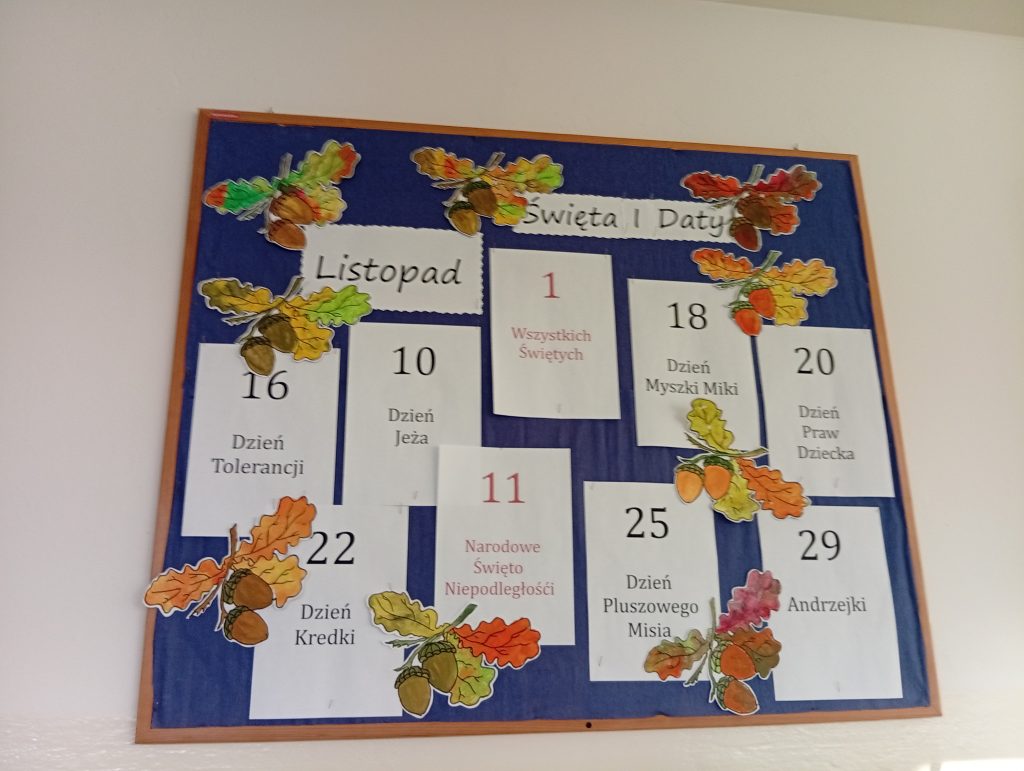W listopadzie często poruszaliśmy tematykę jesienną. Chodziliśmy obserwować zmiany zachodzące w przyrodzie, zbieraliśmy liście, kasztany i żołędzie. Z jesiennych liści wykonaliśmy bukiety. Nasze prace zawiesiliśmy na tablicy w sali świetlicowej.