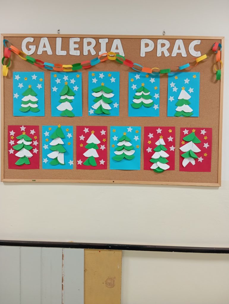 Dzieci w świetlicy szkolnej wykonały również choinki z kółek papierowych w dwóch kolorach. Praca pozwoliła najmłodszym rozwijać zdolności manualne, ćwiczyć precyzję oraz uczyć się kompozycji przy jednoczesnej dobrej, twórczej zabawie. Zajęcia wprowadziły dzieci w radosny, świąteczny klimat, a gotowe choinki stały się piękną dekoracją świetlicy oraz powodem do dumy dla małych twórców.