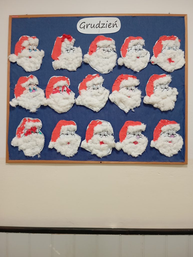 Cały sezon świąteczny w świetlicy jest czasem twórczej aktywności, wspólnej zabawy i budowania relacji. Wśród najpopularniejszych prac znalazły się papierowe śnieżynki oraz łańcuchy na choinkę, które później posłużyły do udekorowania świetlicy. W ramach zajęć świątecznych dzieci w świetlicy szkolnej wykonały urokliwą pracę plastyczną przedstawiająca Mikołaja z miękką, puszysta broda z waty. Zadanie wymagało koncentracji i cierpliwości, ponieważ dzieci musiały kolejno tworzyć elementy postaci oraz zadbać o ich prawidłowe rozmieszczenie. Gotowe prace stały się piękną dekoracją świetlicy.