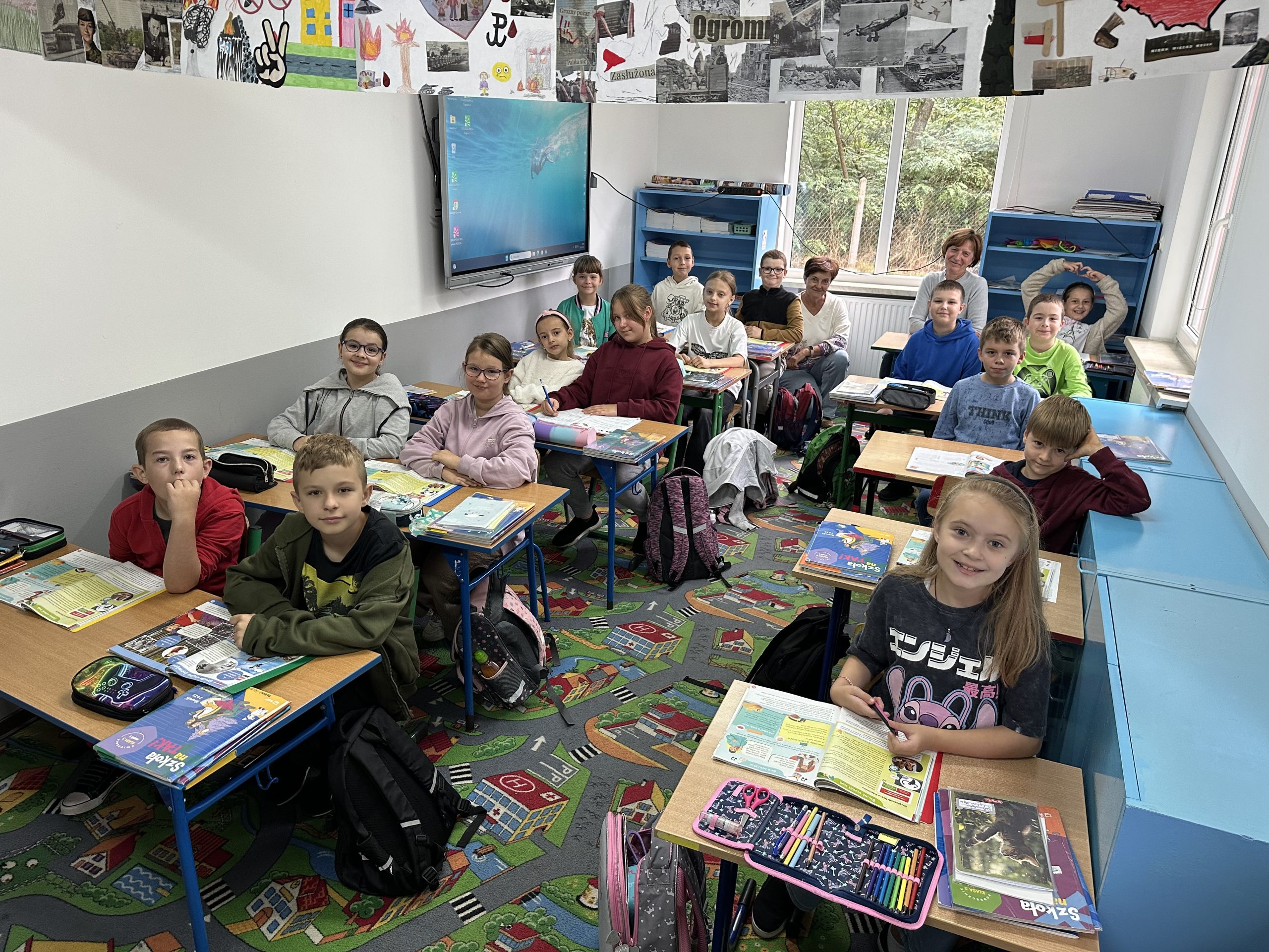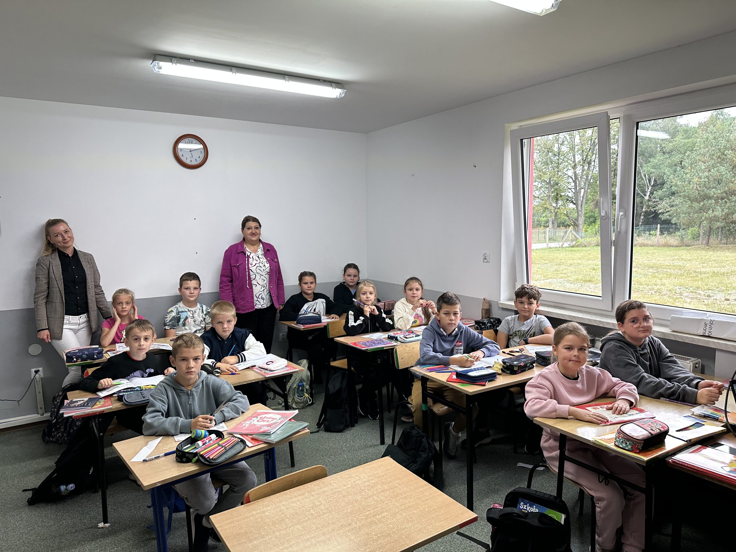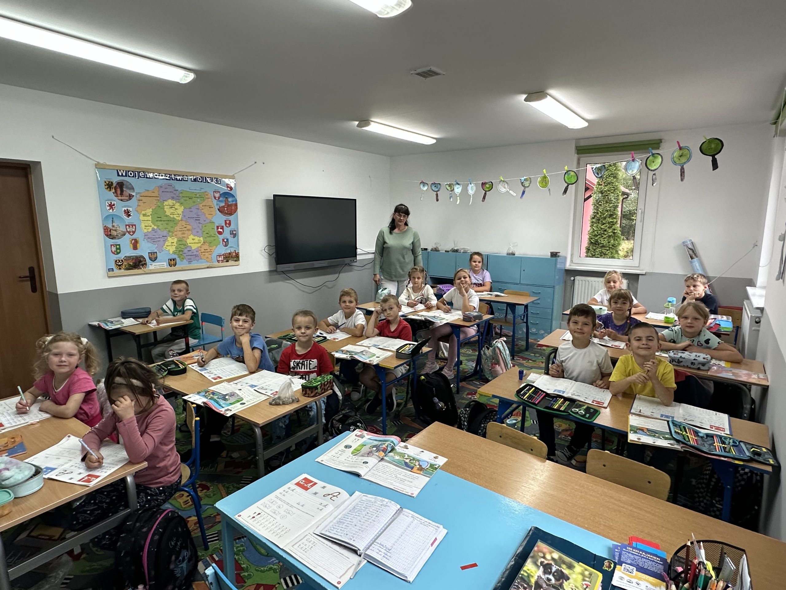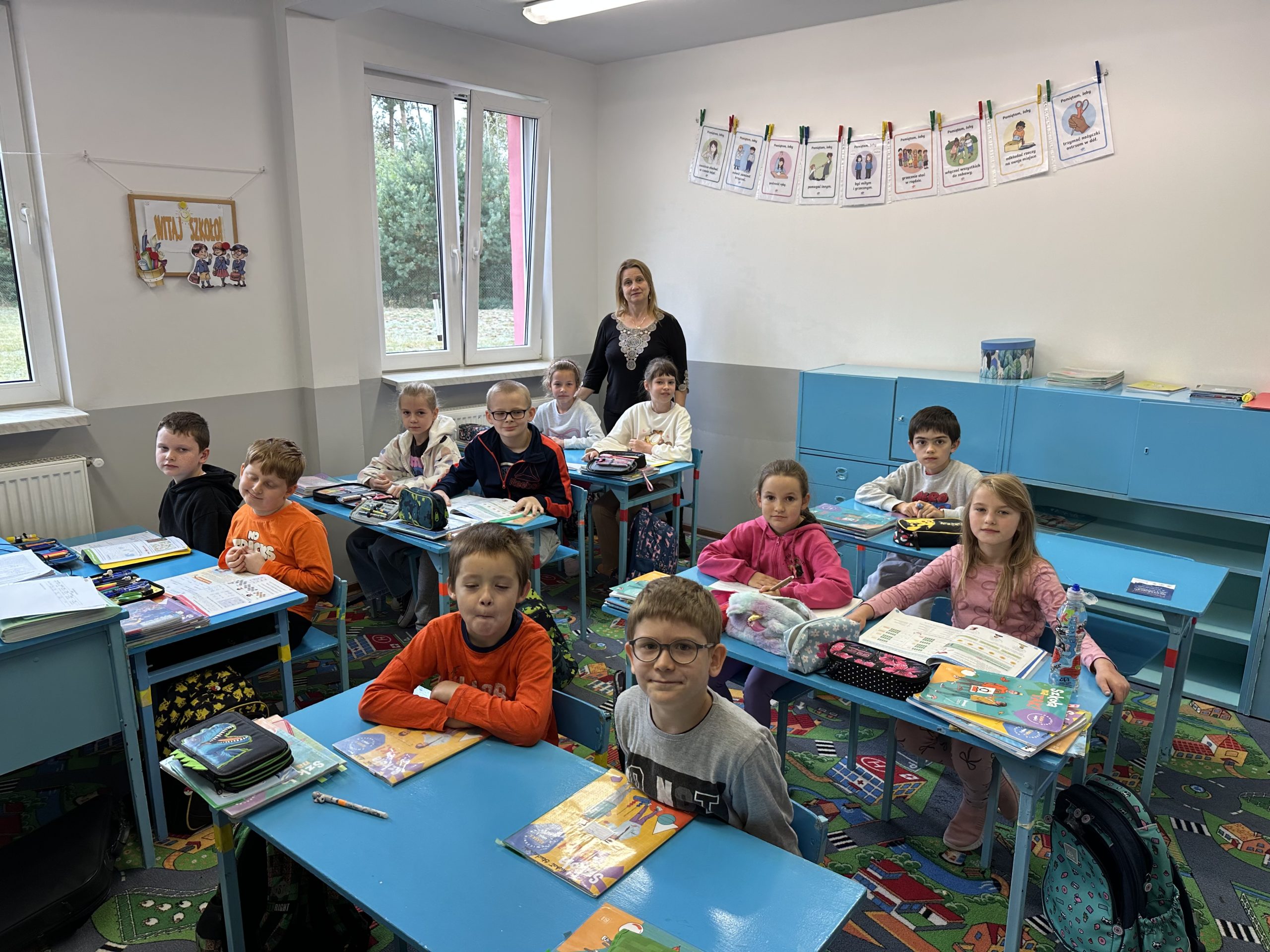 W tym roku szkolnym dużo dzieje się w naszej szkole. Budynek przy ulicy Wojska Polskiego w Komarówce Podlaskiej przechodzi kapitalny remont. Nasza szkolna społeczność musiała dostosować się do zaistniałej sytuacji, dlatego w tym roku szkolnym dzieci uczą się w 3 budynkach. Do budynku po byłym Liceum Ogólnokształcącym przeniosły się dzieci z klas 4 – 8. Na parterze w budynku szkoły podstawowej zostały klasy: 0a, 0b, 1a i 2a. Do budynku po byłej szkole podstawowej w Walinnie przeniosły się dzieci z klasy: 1b, 2b, 3a i 3b. I tutaj właśnie warunki nauki są najbardziej odmienne od tych, do których dzieci były przyzwyczajone. Szkoła jest drewniana, parterowa, ale bardzo przyjazna, czysta i wyremontowana. Dzieci uczą się w 4 salach. Na lekcje i przerwy dzwoni dzwonkiem ręcznym pani Jola pełniąca rolę sprzątaczki. Uczniowie szybciutko nauczyli się reagować na dźwięk takiego dzwonka. Na każdej przerwie dzieci wybiegają na podwórko szkolne. Korzystają również z gminnego placu zabaw, który bardzo lubią odwiedzać. W otoczeniu szkoły jest cicho i bardzo dużo zieleni, jak na „zielonej szkole”. Na każdej przerwie dużą popularnością cieszą się obserwacje pająka, który zbudował swoją kryjówkę wśród liści juki. Uczniowie mają możliwość obcowania z przyrodą na co dzień. Uczenie się w takich warunkach jest naprawdę bardzo przyjemne. Dzieci dowożone są 2 autobusami. Rano przyjeżdżają przed godziną 8:00 i są odwożone od razu po skończonych lekcjach. Na zajęcia do Walinny dojeżdżają też panie uczące religii i języka angielskiego. W szkole jest ciepło i bezpiecznie.