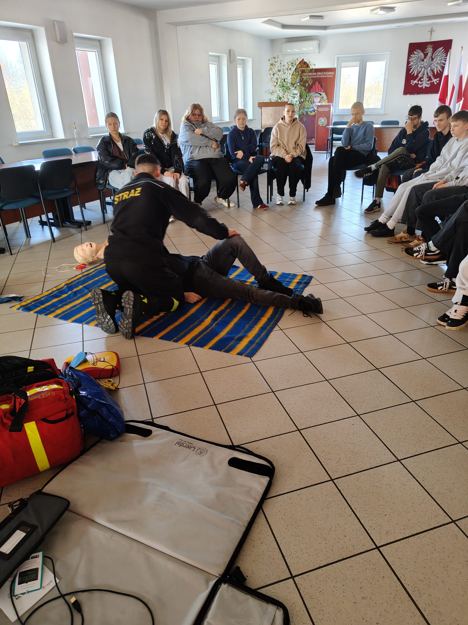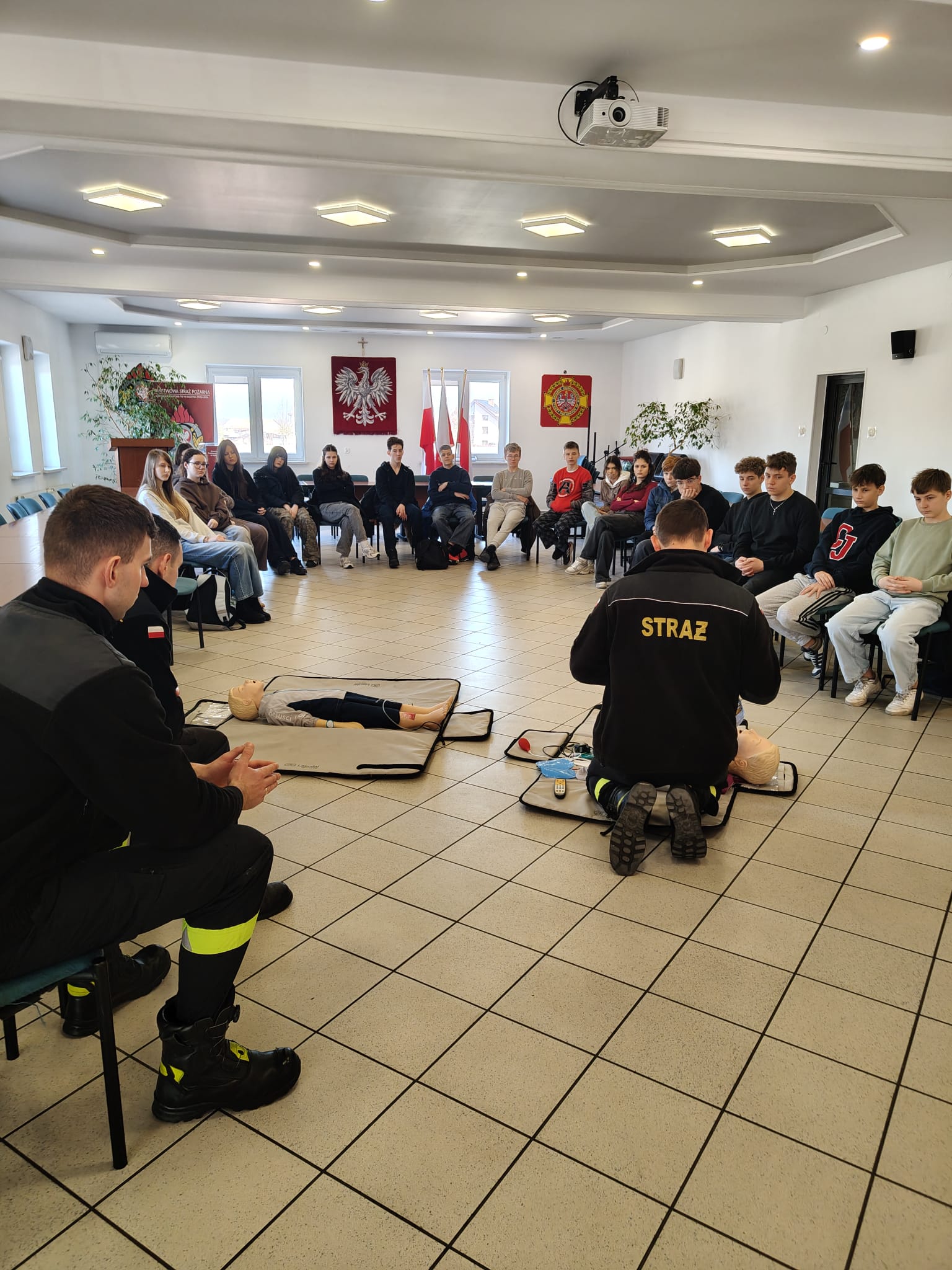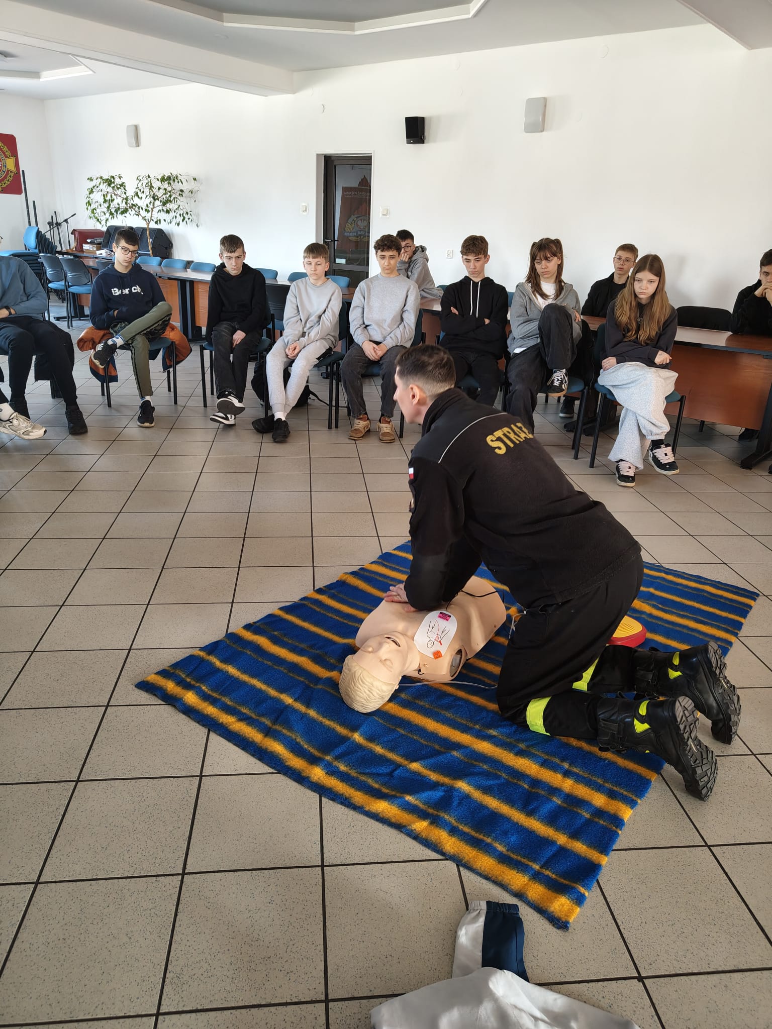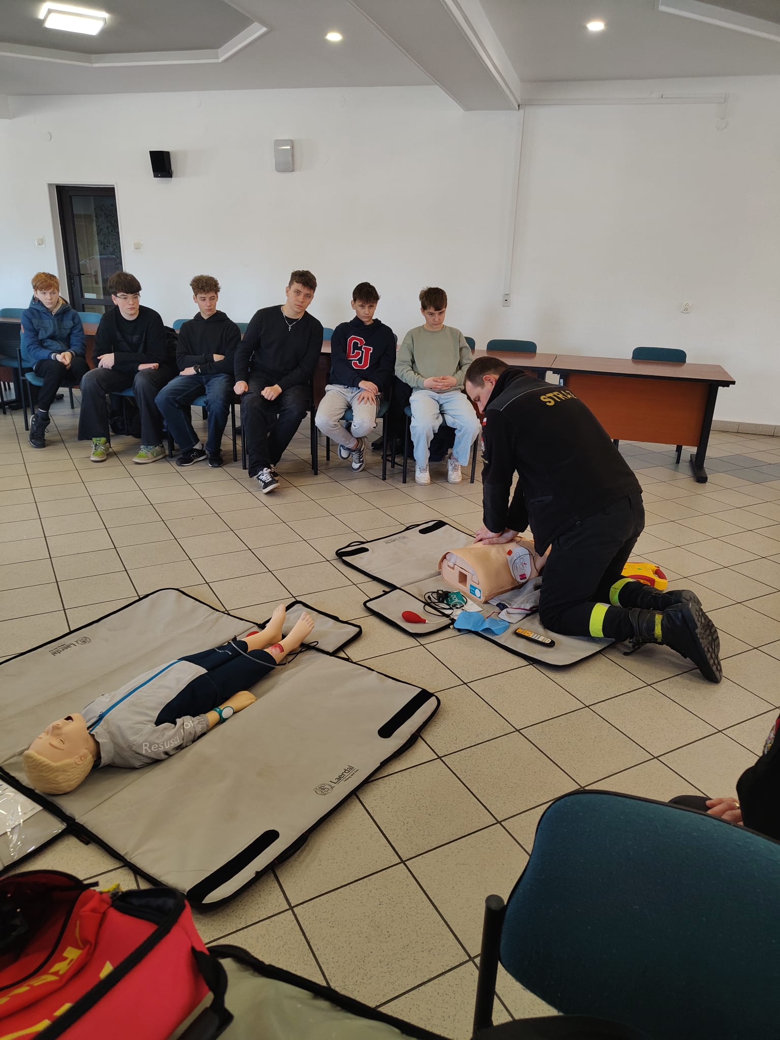 Podczas spotkania strażacy w przystępny i ciekawy sposób przybliżyli uczniom zagadnienia związane z bezpieczeństwem. Uczniowie poznali podstawowe zasady udzielania pierwszej pomocy przedmedycznej oraz właściwego reagowania w sytuacjach zagrożenia zdrowia i życia. Po części teoretycznej odbyły się zajęcia praktyczne – uczniowie mieli możliwość ćwiczenia udzielania pierwszej pomocy na fantomach pod okiem strażaków, co pozwoliło im w praktyce przećwiczyć zdobytą wiedzę.